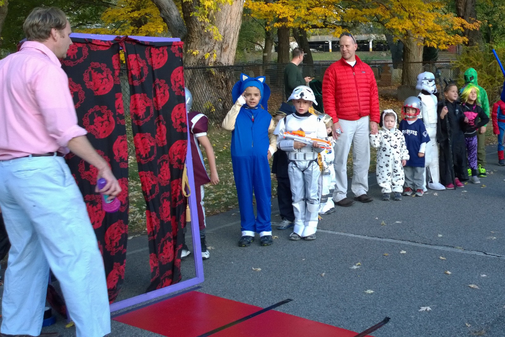 John was the MC of the Halloween fashion show. He announced each child’s name and the costume. Then the child would part the curtains and walk down the red carpet. Some ran to their parents. Some would strike a pose.