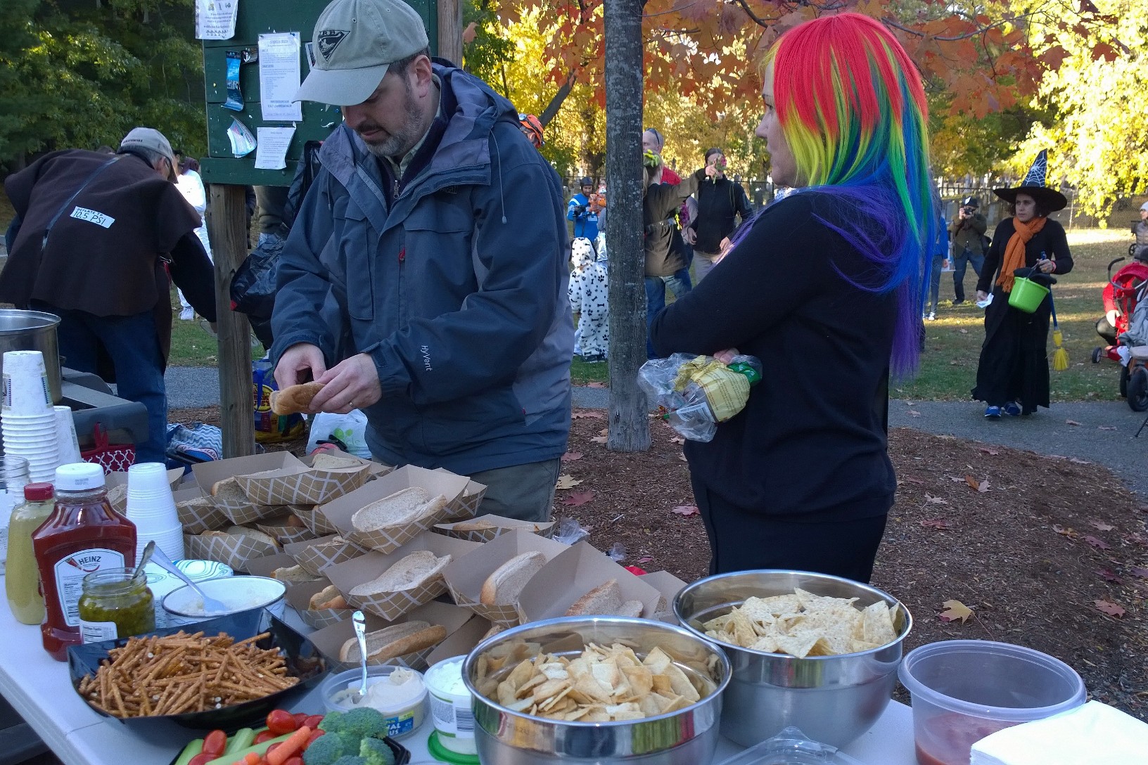 Neighbors gathered in a park for food, games, and showing off costumes.