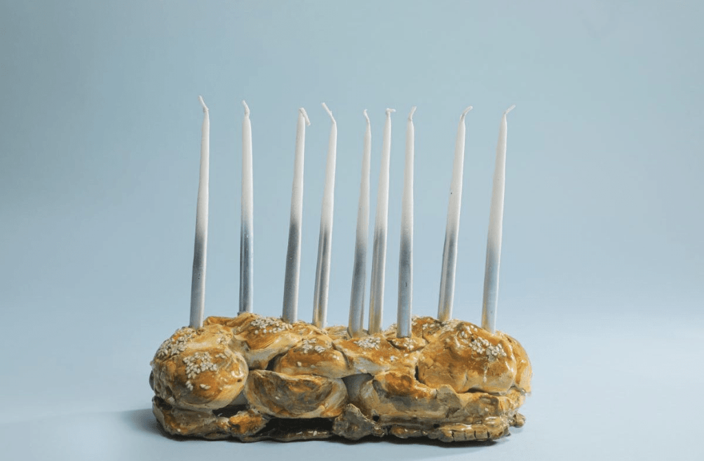 “Why not celebrate Hanukkah with a candle-lit shoutout to everyone’s favorite egg bread? This incredible menorah [above] was created by visual artist and curator Janie Korn, and is sure to make any carb-lover light up.