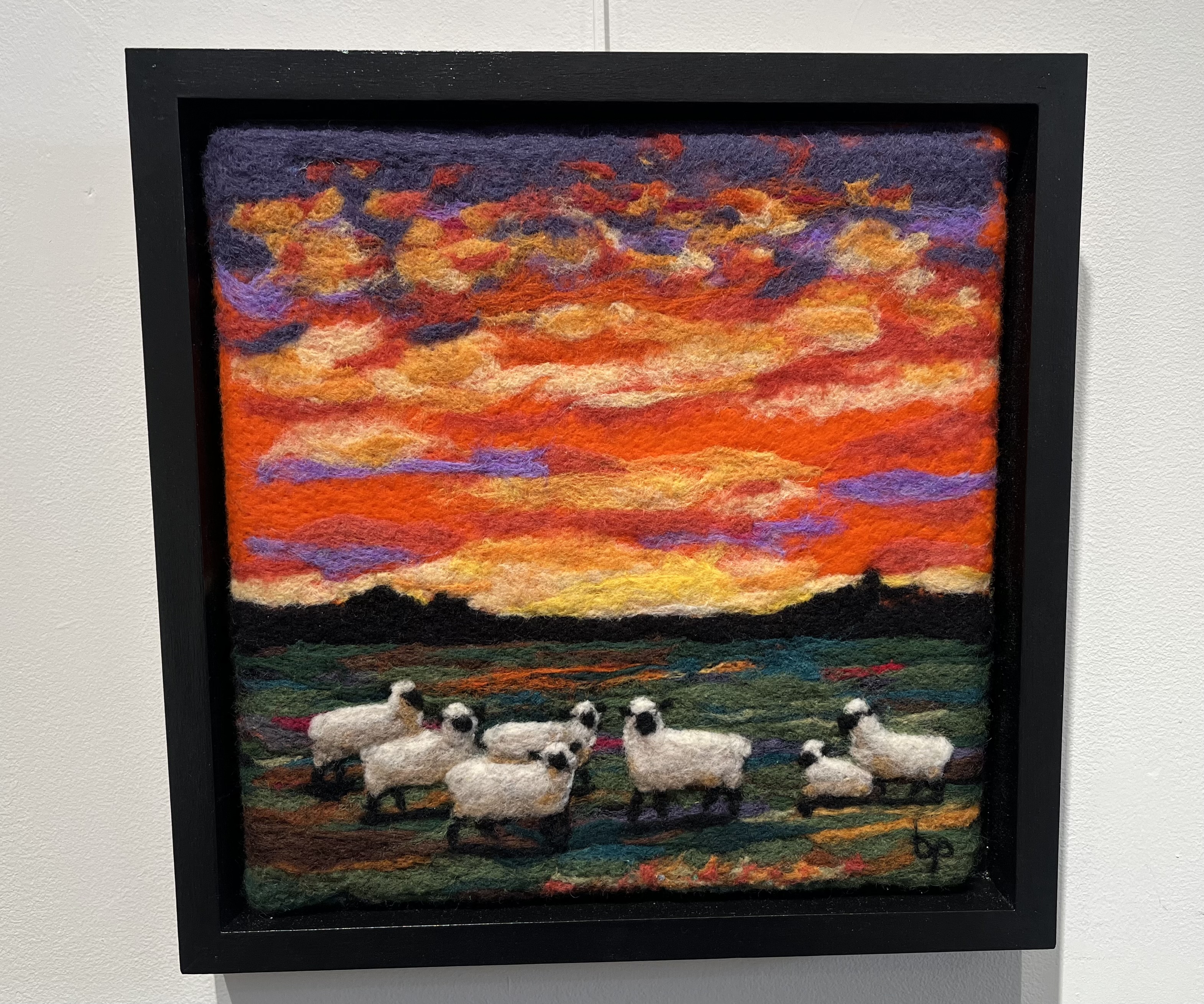 I was drawn to the piece above because I love islands. This one is emerging from the sea in an unspoiled form. It felt hopeful. Below is one called “Sky with 7 Sheep.” It practically leapt from the wall.