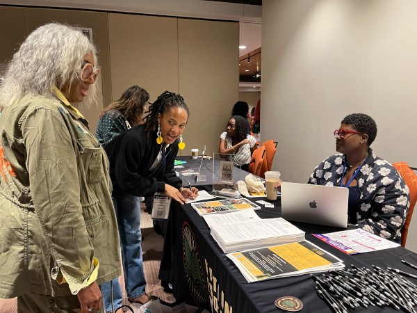 Ashley Valentine (r) of Rooted MKE, a BIPOC children’s bookstore in Milwaukee processes the membership of Shannon Taylor (c) of Pages & Volumes Bookstore in Washington, DC, while Darnelle McGuire-Nelson (l) of B & E’s Literary Treasures in Alexandria, Va. observes during New Voices New Rooms in Atlanta.