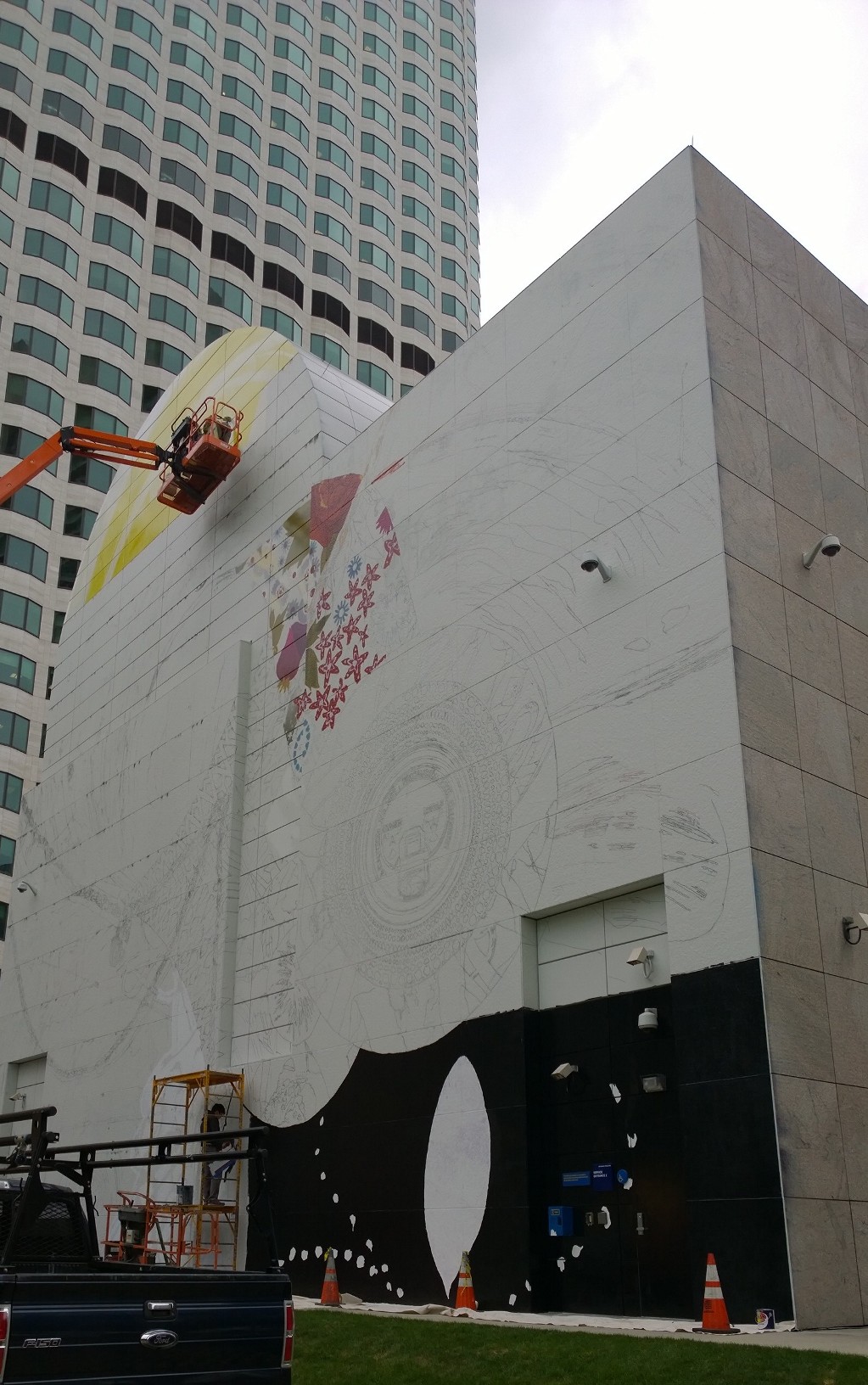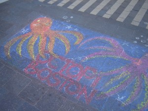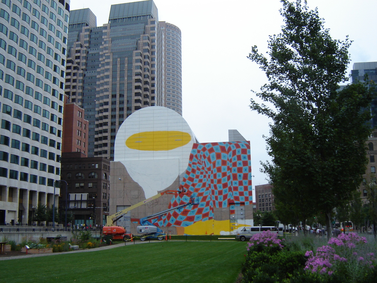 Moving on to Boston, where I had to go to renew my senior discount for public transit, I made a stop in Dewey Square. I always like checking out the latest Greenway mural. This one is by Daniel Gordon. It’s not as edgy as some I admired in the past.