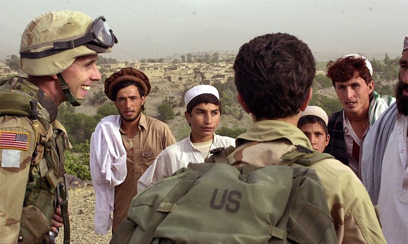 An Afghan interpreter assists U.S. military personnel trying to locate Taliban weapons.