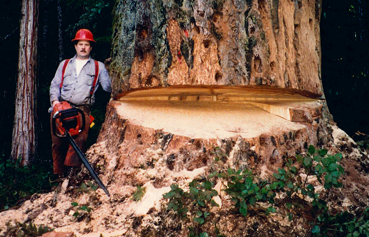 Ancient Forest Alliance photographer TJ Watt and an ancient Western red cedar. The tree is estimated to be 46 metres high [150 feet]. It is located on Flores Island, in Clayoquot Sound off Vancouver Island in the territory of Canada’s Ahousaht tribe.