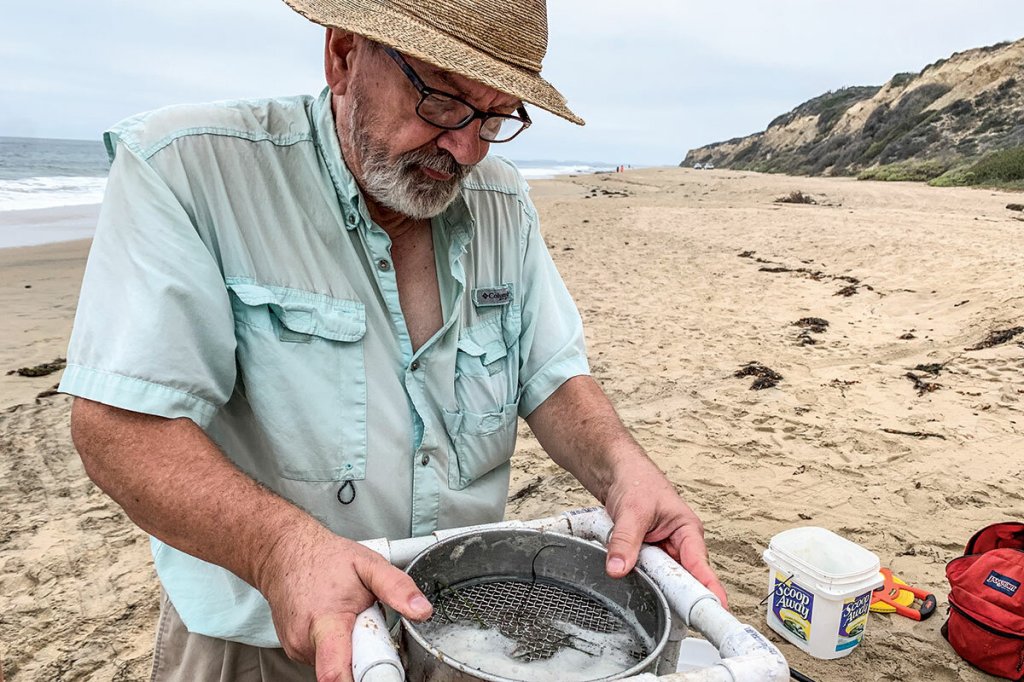 Dr. Mark McReynolds sifts collected sand through a sieve that brings microplastics to the surface.