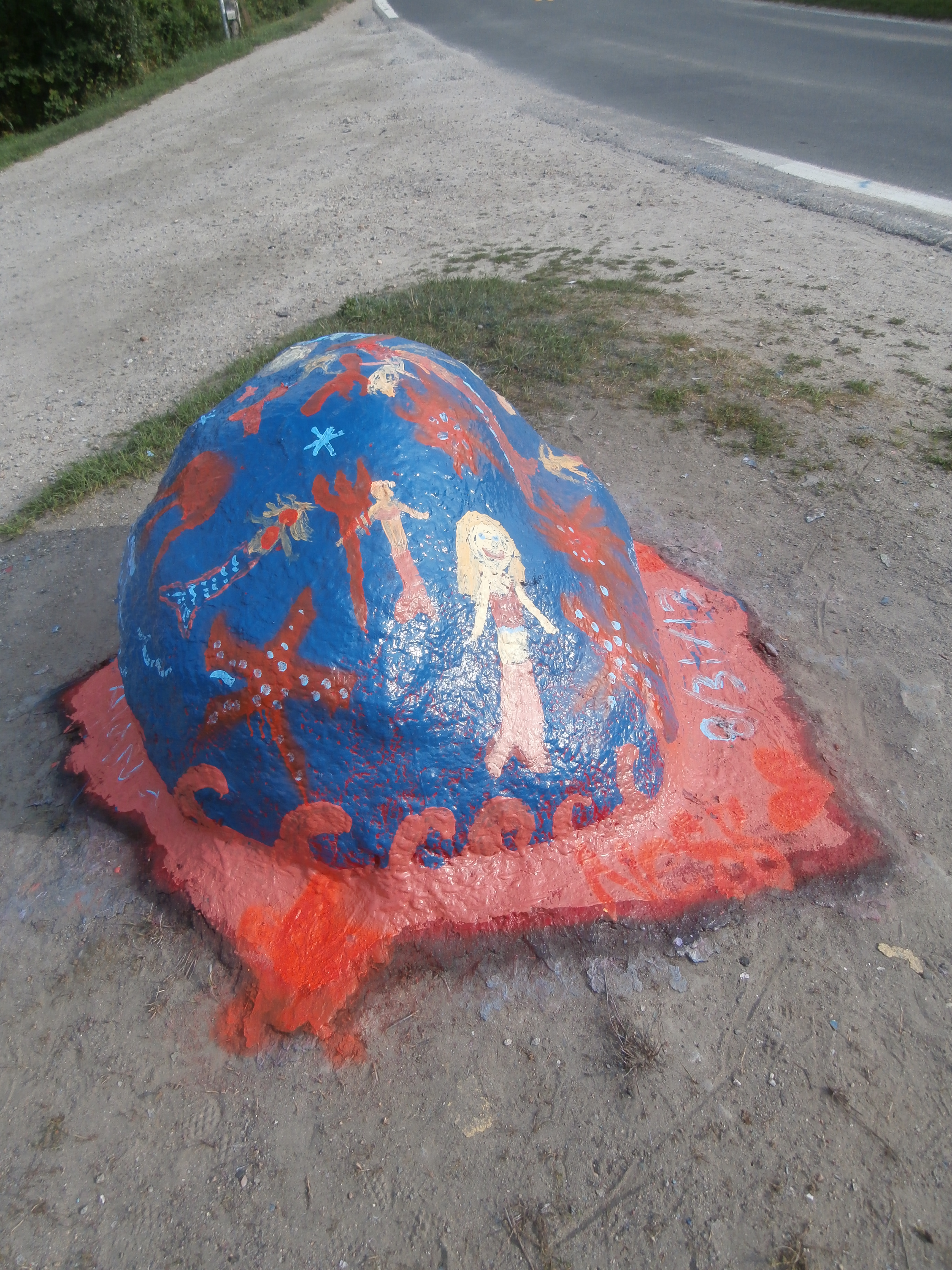 The first picture is of a rock that gets repainted all summer long — sometimes a few times a day — with pictures and messages of various kinds. This painting features mermaids, starfish, and octopi.